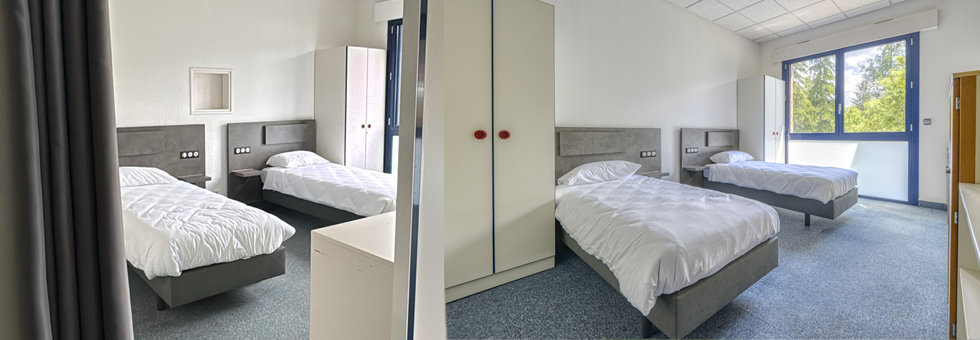 24 chambres de 9 lits, chacune compartimentée en 4 box de 2 lits simples et 1 box d’1 lit.